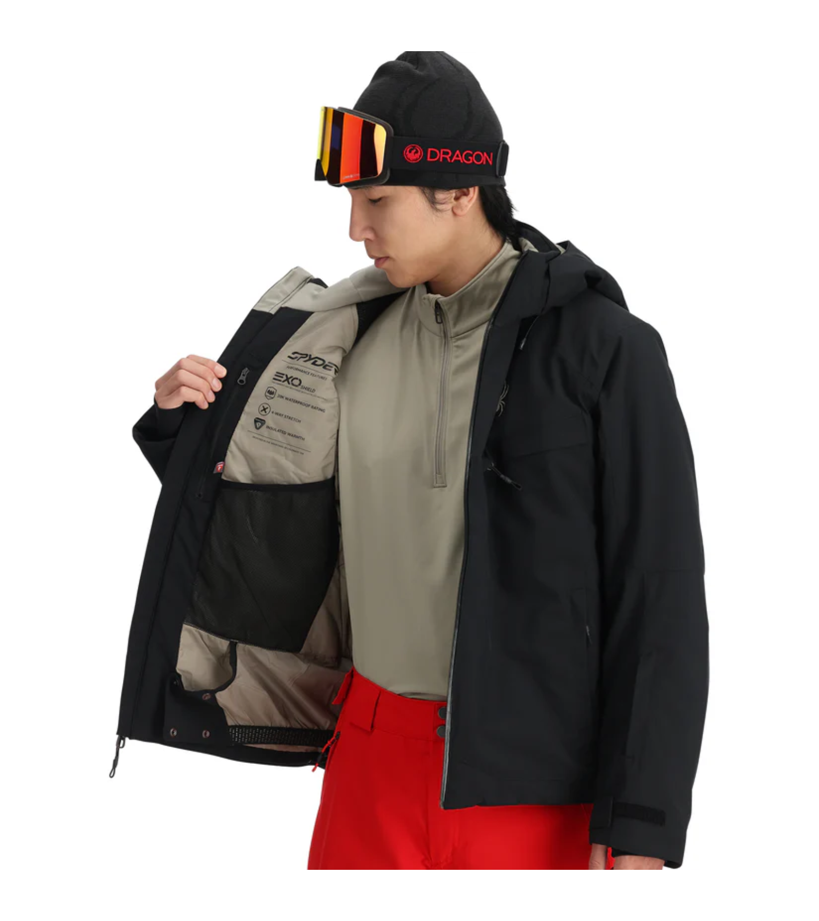 - Bronze Chassis: Taffeta lining, fixed powder skirt with snap-back feature, mesh padding at shoulders, internal zippered pocket, mesh goggle pocket, and chamois lens wipe